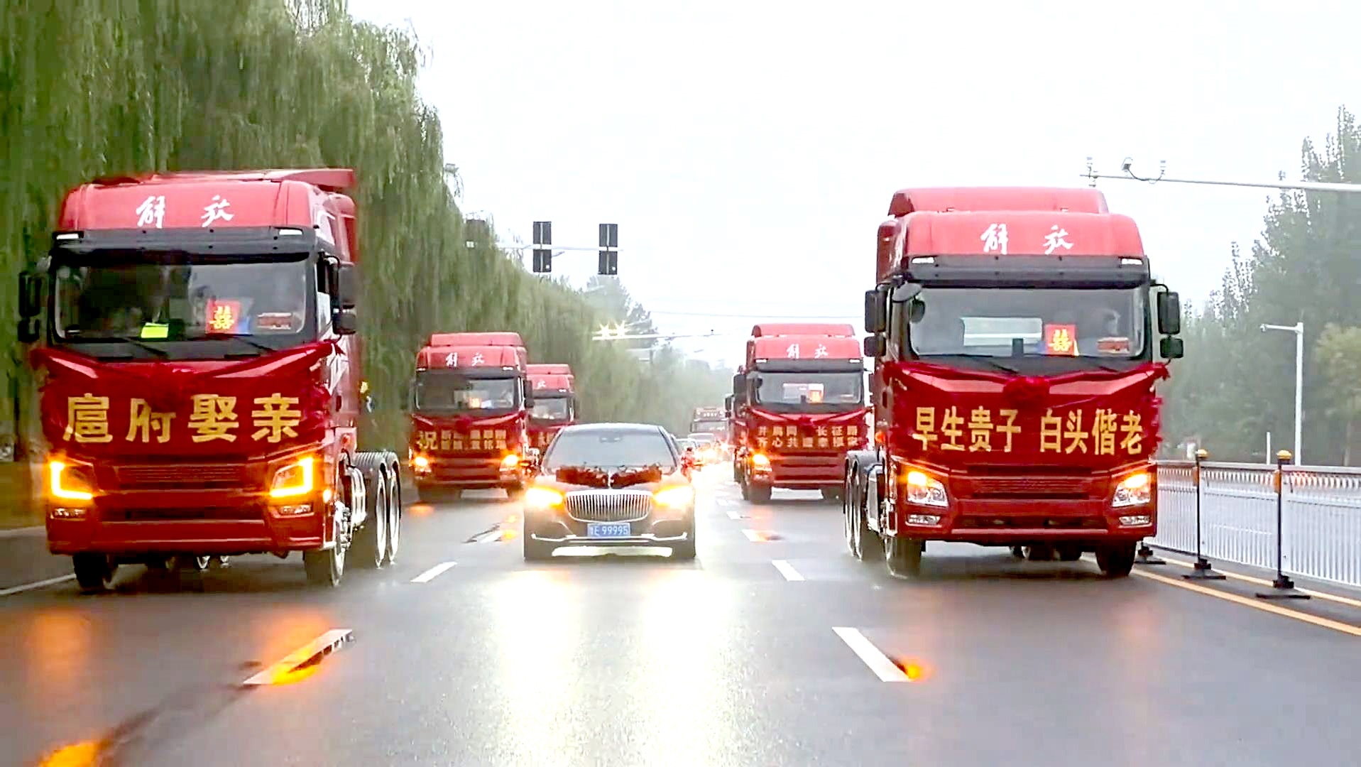视频图像显示,婚礼车队由梅赛德斯 - 奔驰轿车领导,六辆重型红色风扇卡车分为两列,然后继续。卡车的前部以祝福的口号出版,称为“人豪宅中的婚姻”,“出生,一个早期的儿子,在一起时代”和“离开漫长的游行,一起工作并建立一个幸福的家庭”。
