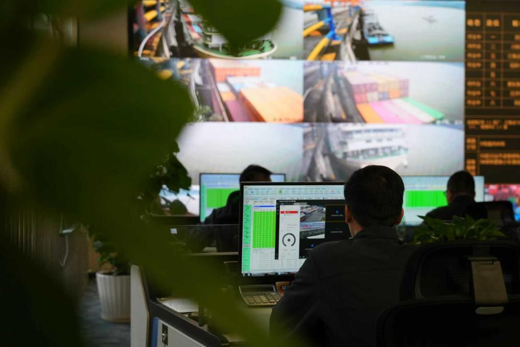 重庆果园港遥控室里的集装箱,工作人员正在吊装它。新华社记者 李爱斌 供图